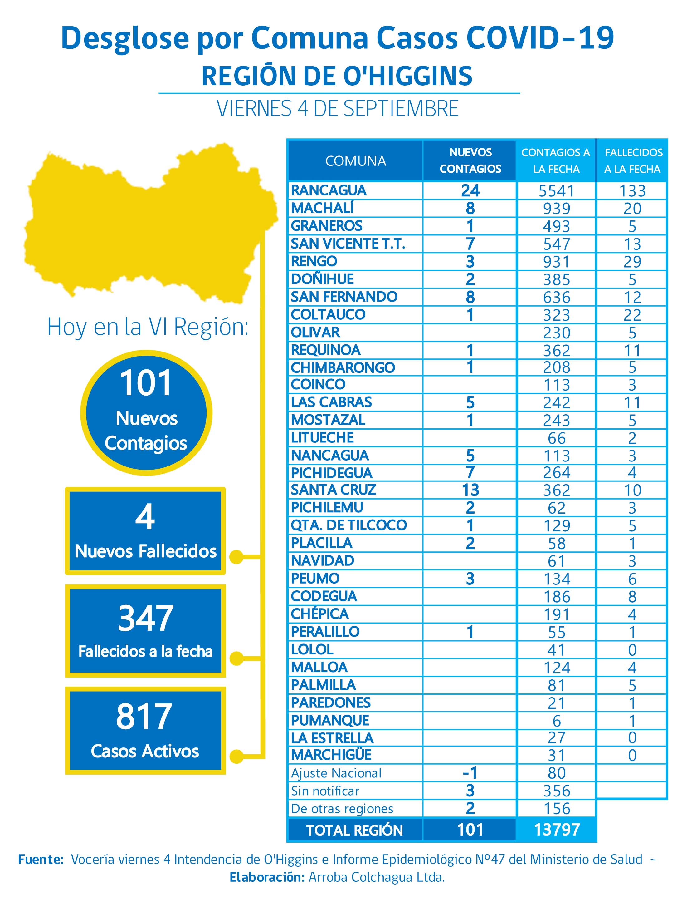 Los casos nuevos por comunas corresponden a 24 de Rancagua, 13 de Santa Cruz, 8 de Machalí, 8 de San Fernando, 7 de Pichidegua, 7 de San Vicente, 5 de Las Cabras, 5 de Nancagua, 3 de Peumo, 3 de Rengo, 2 de Doñihue, 2 de Pichilemu, 2 de Placilla, y 1 caso en las comunas de Chimbarongo, Coltauco, Graneros, Mostazal, Peralillo, Quinta de Tilcoco y Requínoa. Caso de otras regiones 2 y 3 casos sin notificar.