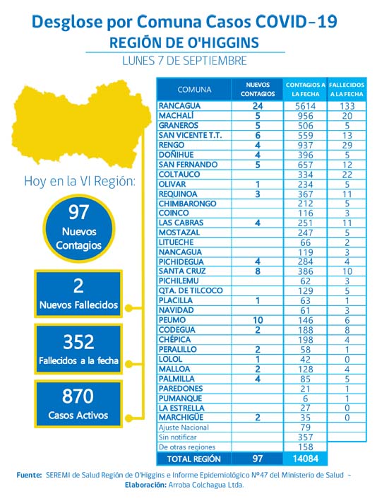 El desglose por comunas es el siguiente, 24 casos en Rancagua, 10 en Peumo, 8 en Santa Cruz, 6 en San Vicente, 5 en Graneros, 5 en Machali, 5 en San Fernando, 4 en Doñihue, 4 en Pichidegua, 4 en Rengo, 4 en Las Cabras, 4 en Palmilla, en 3 Requinoa, 2 en Codegua, 2 en Malloa, 2 en Peralillo, 2 en Marchigue, 1 en Olivar, 1 en Placilla y 1 en Lolol