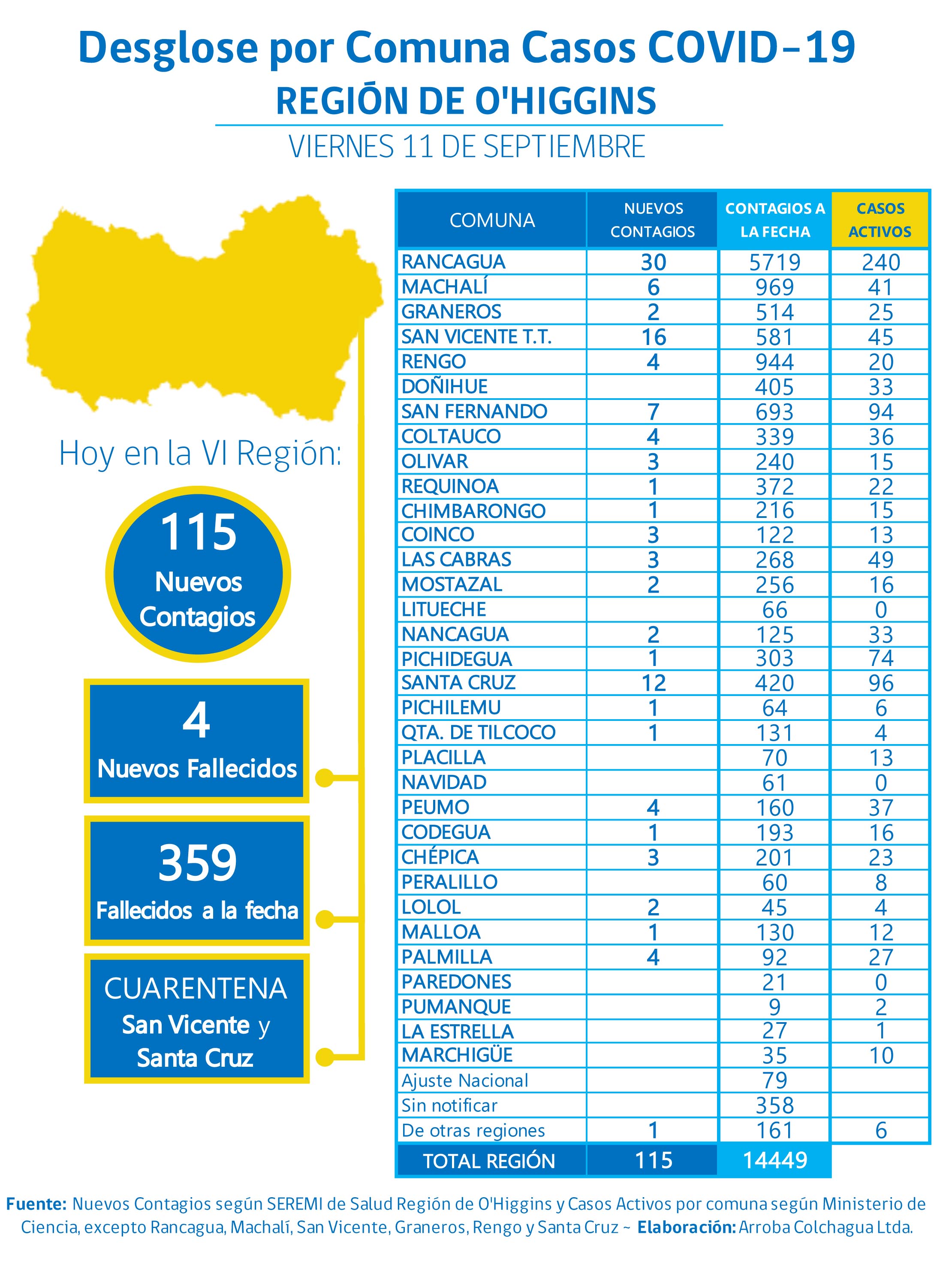 Hoy viernes se reportaron 115 nuevos casos de COVID-19 en la región de O´Higgins, tal como lo indica la gráfica, hay 14.449 contagios totales por la enfermedad, mientras que hoy se informó de cuatro personas fallecidas por la pandemia, dando un saldo acumulado de 359 decesos a causa de la enfermedad.