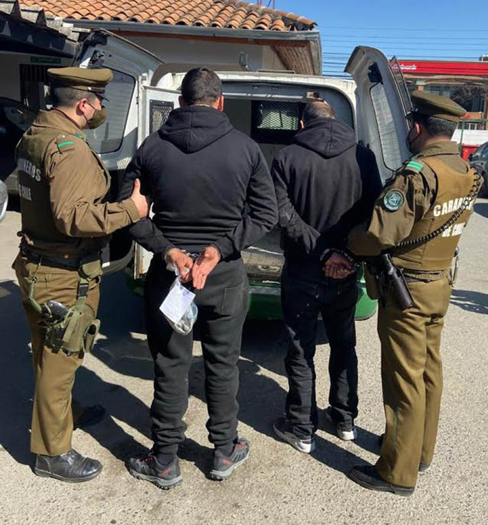 Con los antecedentes en su poder, carabineros activó un rápido procedimiento policial y mediante distintas investigaciones se logró dar con el paradero y detener a dos sujetos de 47 y 35 años de edad, ambos con antecedentes policiales, quienes dejaron abandonados en el antejardín de una clínica dental de calle Cuevas, dos sacos y dos bolsos deportivos con diferentes objetos.