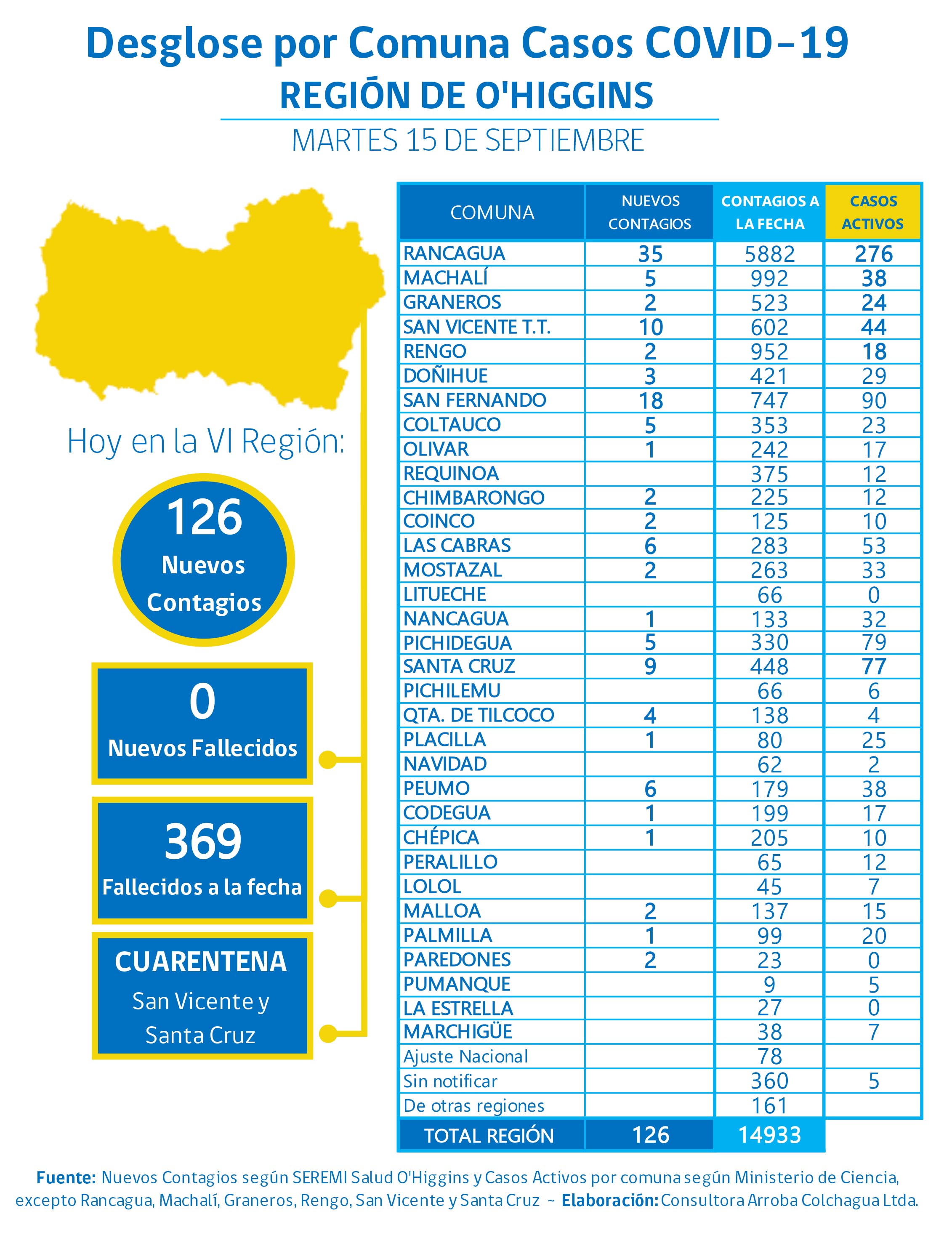 El desglose por comunas es el siguiente, Rancagua 35 casos, San Fernando 18, San Vicente 10, Santa Cruz 9, Las Cabras 6, Peumo 6, Coltauco 5, Machalí 5, Pichidegua 5, Quinta de Tilcoco 4, Doñihue 3, Chimbarongo 2, Coinco 2, Graneros 2, Malloa 2, Mostazal 2, Paredones 2, Rengo 2, Chépica 1, Codegua 1, Nancagua 1, Olivar 1, Palmilla 1 y Placilla 1 caso.