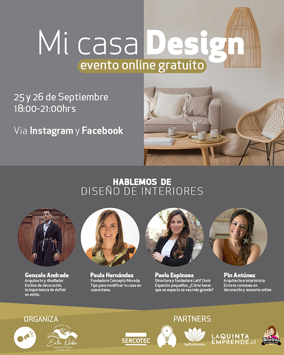 En el encuentro, financiado por Sercotec, los artesanos mostrarán sus productos y conversarán acerca de sus experiencias. Además, destacados expositores abordarán distintas temáticas sobre decoración y diseño de interiores: “La importancia de definir un estilo”, a cargo del arquitecto y diseñador Gonzalo Andrade; “Espacios pequeños: ¿cómo hacer que un espacio se vea más grande” con Paola Espinoza, directora y fundadora de Latif Doré; “Errores comunes en decoración y asesoría online”, junto a la arquitecta e interiorista Pin Antúnez, y “Tips para modificar tu casa en cuarentena” con Paula Hernández, fundadora de Concepto Morada.