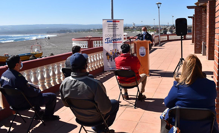 En la caleta de Pichilemu, el Gobernador Provincial de Cardenal Caro, Carlos Ortega, y autoridades de la zona, presentaron los alcances del concurso ante representantes de los pescadores artesanales de la Región de O’Higgins, cuya actividad se ha visto afectada como consecuencia de la pandemia.