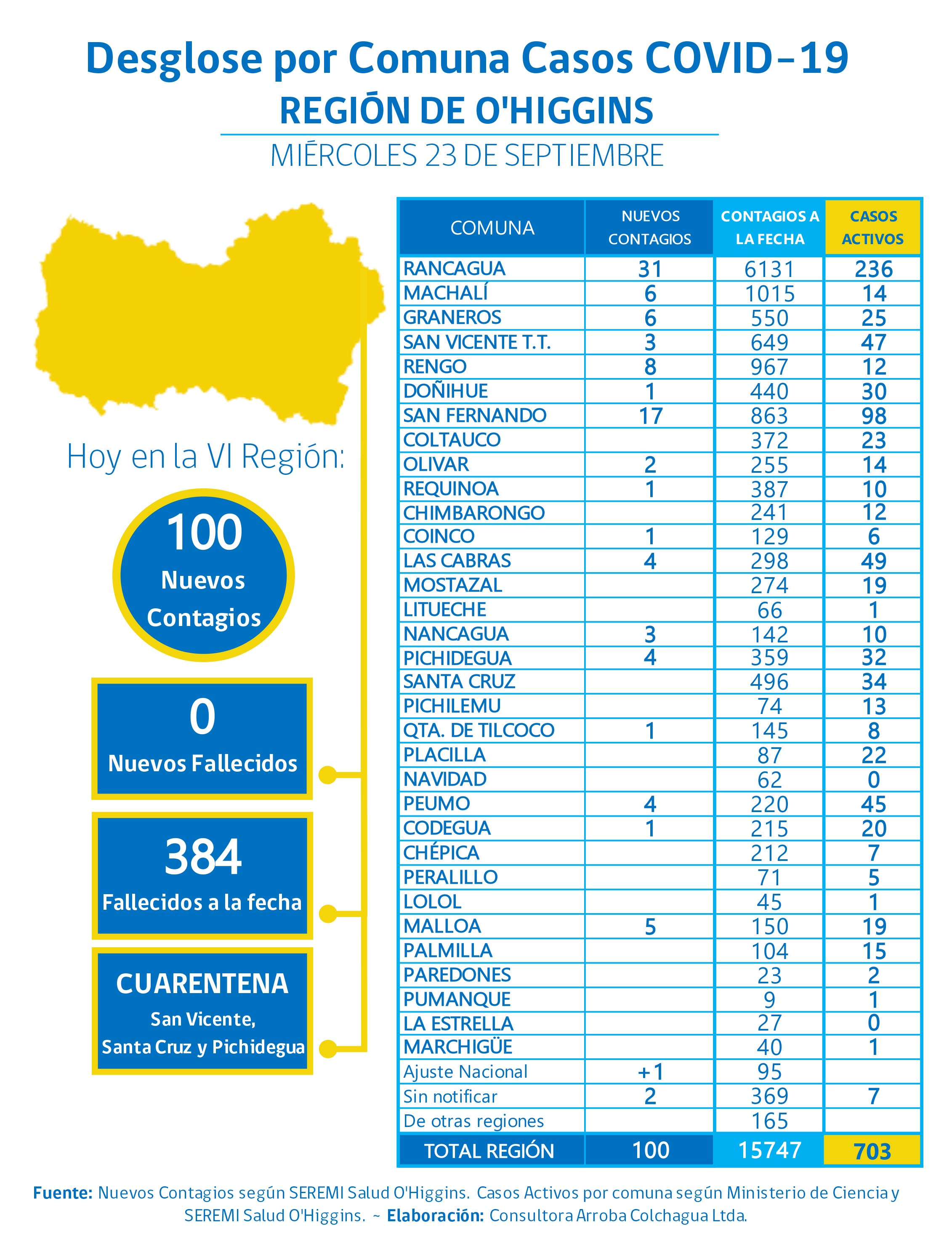 El desglose por comunas es el siguiente Rancagua 31 casos, San Fernando 17, Rengo 8, Graneros 6, Machalí 6, Malooa 5, Las Cabras 4, Peumo 4, Pichidegua 4, Nancagua 3, San Vicente T.T. 3, Olivar 2, Codegua 1, Coinco 1, Doñihue 1, Quinta de Tilcoco 1, Requínoa 1 y 2 casos sin notificar.
