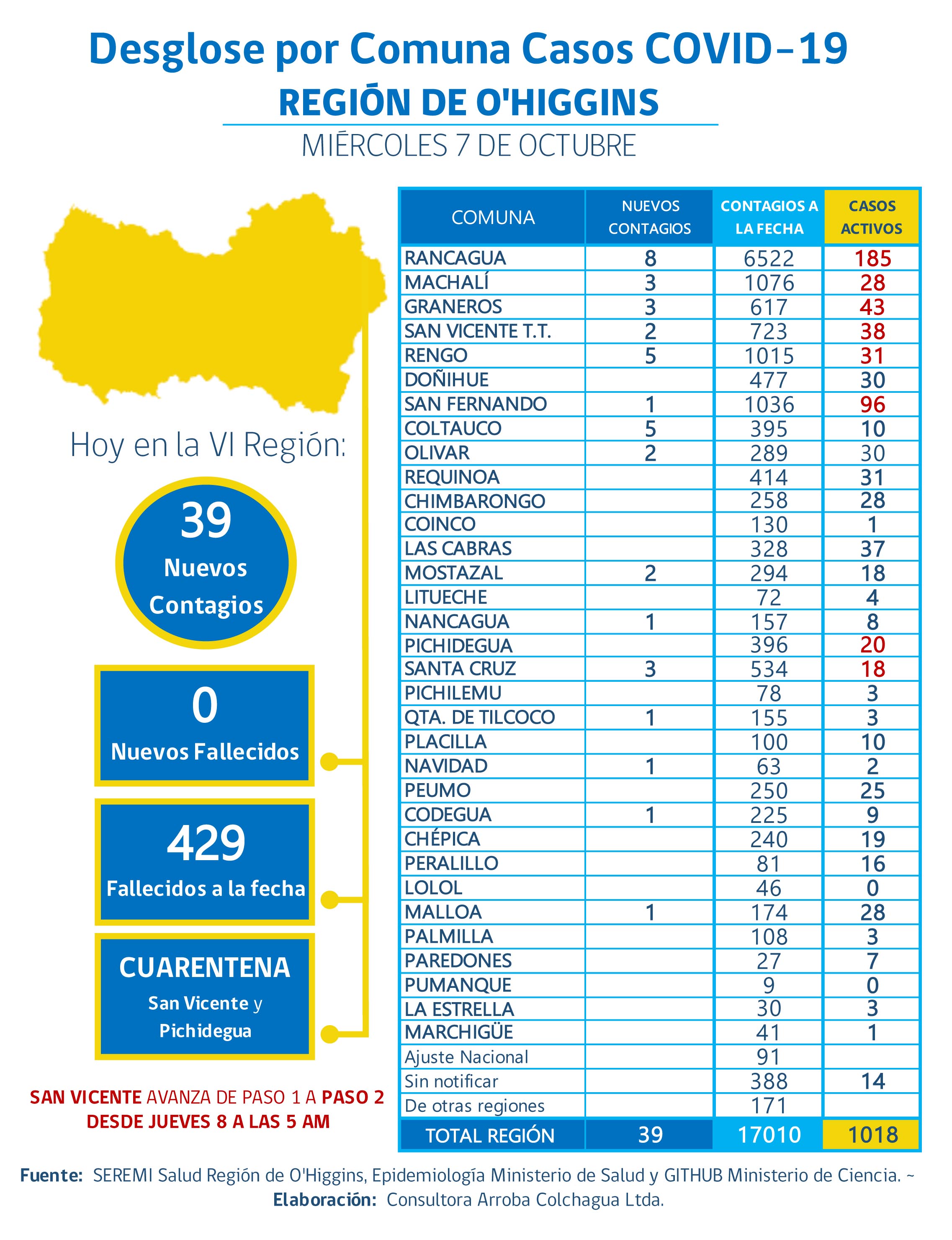 El desglose por comunas es el siguiente, 8 en Rancagua, 5 en Coltauco, 5 en Rengo, 3 en Graneros, 3 en Machalí, 3 en Santa Cruz, 2 en Mostazal, 2 en Olivar, 2 en San Vicente de Tagua Tagua, 1 en Codegua, 1 en Malloa, 1 en Nancagua, 1 en Navidad, 1 en Quinta de Tilcoco y 1 en San Fernando.