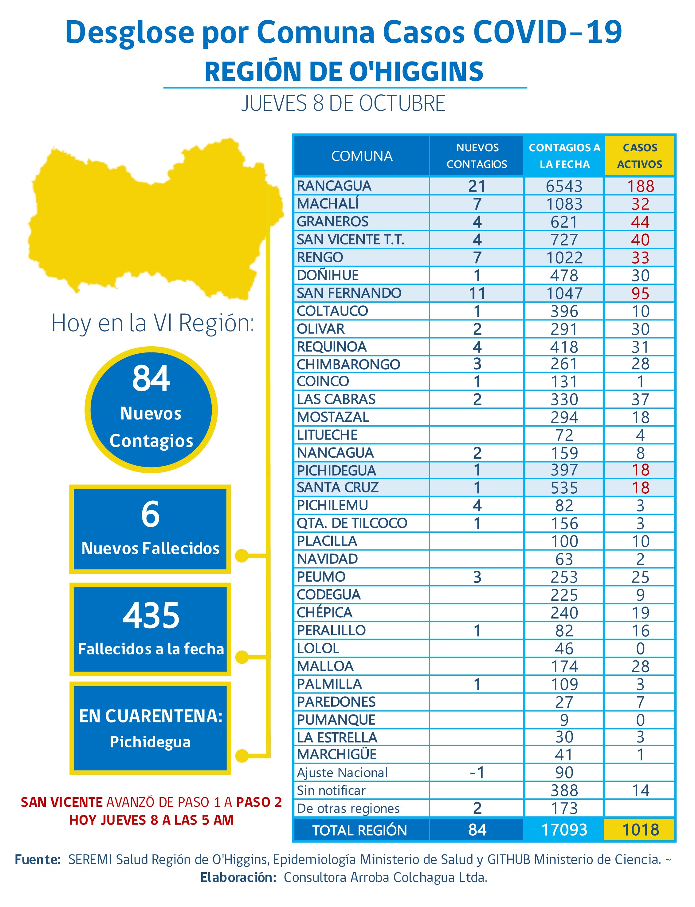 El Minsal en su informe diario del avance del Covid-19 en el país no hizo anuncios para la región de O’Higgins, en lo que se refiere al Plan Paso a Paso, manteniéndose en Cuarentena total solo la comuna de Pichidegua, mientras que en Transición siguen las comunas de Rancagua, San Fernando, Rengo, Santa Cruz, Graneros, Machalí y desde hoy también San Vicente.