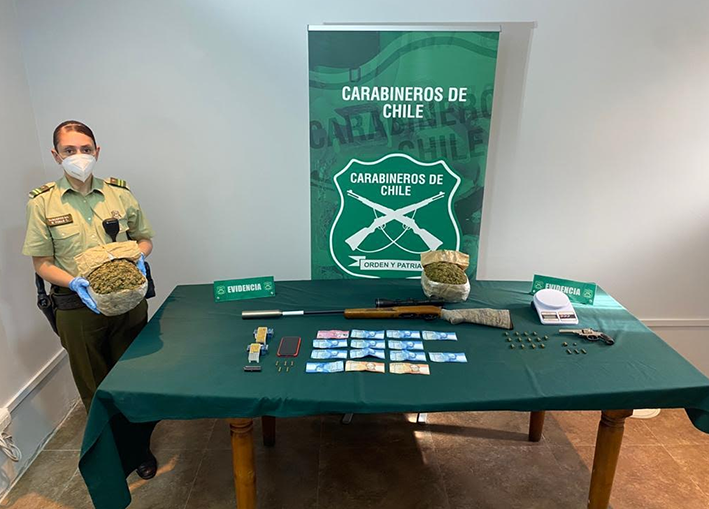 En el inmueble, los efectivos policiales incautaron dos paquetes con más de dos kilos de marihuana, un rifle calibre 22 con mira telescópica, un revólver calibre 38, 106 cartuchos balísticos de distintos calibres, una camioneta, un teléfono celular y 155 mil pesos en dinero en efectivo.