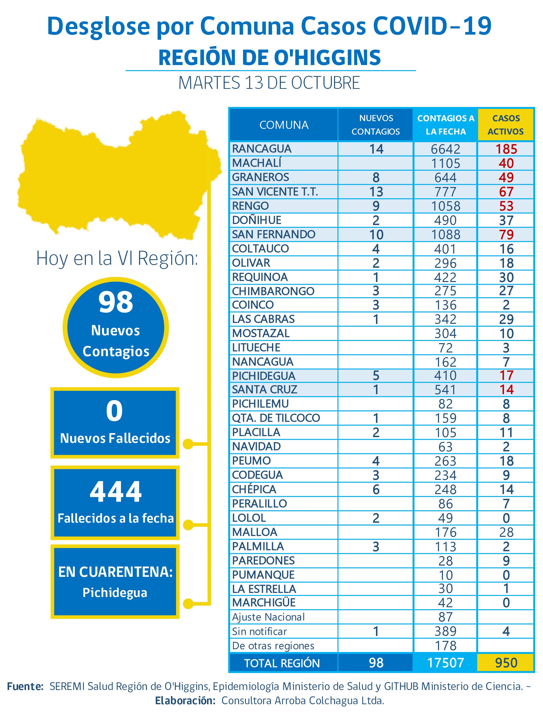 El reporte por comunas es el siguiente: 14 casos en Rancagua, 13 en San Vicente,10 San Fernando, 9 casos en Rengo, 8 en Graneros, 6 Chépica, 5 en Pichidegua, 4 casos en Coltauco y Peumo, 3 en Chimbarongo, Codegua, Coinco y Palmilla, 2 en Doñihue, Lolol, Olivar y Placilla y 1 caso en Las Cabras, Quinta de Tilcoco, Requínoa y en Santa Cruz y un caso sin notificación.