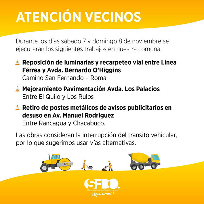 La Municipalidad de San Fernando informa a la comunidad que durante este fin de semana (sábado 7 y domingo 8) se ejecutarán importantes trabajos viales en dos concurridas zonas de conectividad de la comuna, por lo cual se llama a conductores y vecinos a adoptar los resguardos pertinentes y buscar alternativas ante el cierre parcial de calzadas.