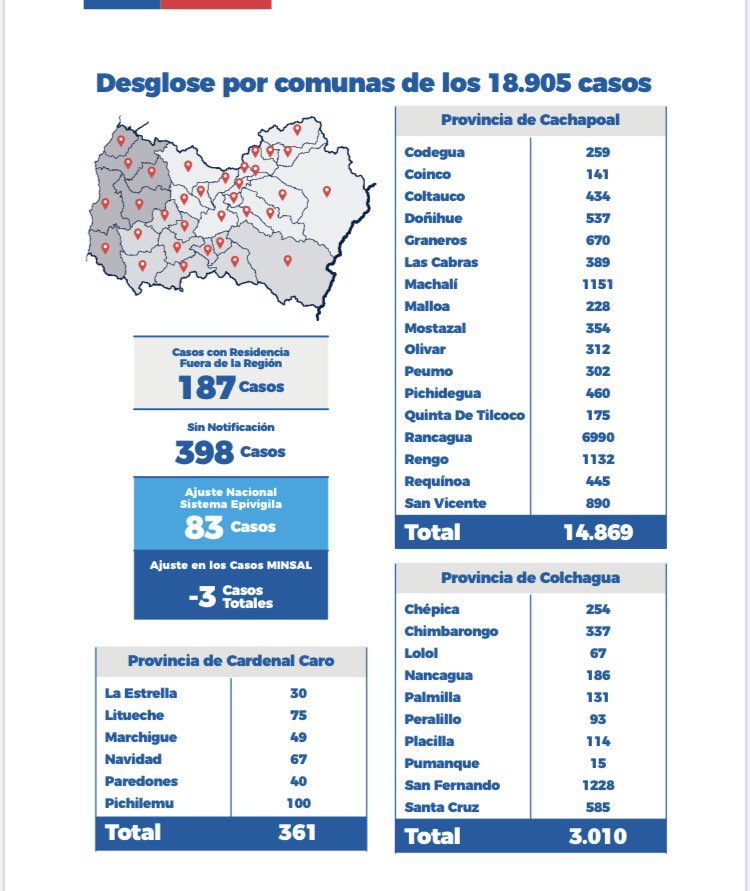 El desglose por comunas es el siguiente,14 casos en Rancagua, 8 en Machalí, 5 en San Fernando, 4 en Pichilemu y San Vicente, 3 en Graneros, Mostazal y Pumanque, 2 Pichidegua y Quinta de Tilcoco y 1 caso en las comunas de Chimbarongo, Codegua, Las Cabras, Nancagua, Palmilla, Placilla, Requínoa y Santa Cruz, 1 caso en otras regiones y 2 casos sin notificar.