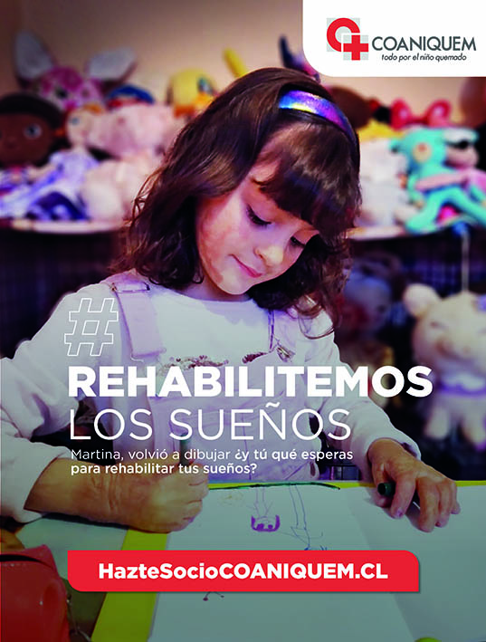 Junto con llamar a todos a cuidar a nuestros niños y evitar sus quemaduras en el hogar, COANIQUEM invita a la comunidad a sumarse como socios cooperadores realizando un aporte mensual. La campaña #RehabilitemosLosSueños se centra en los sueños de los niños que se vieron truncados cuando se quemaron, pero que hoy gracias al apoyo mensual de los socios cooperadores, pueden volver a ser una realidad, gracias a la rehabilitación recibida en COANIQUEM. "Antes de llegar a COANIQUEM la Martina tuvo el peor pronóstico con sus manos y en la primera consulta con el fisiatra de COANIQUEM, el doctor me dio la tranquilidad de que a los 5 años, cuando entrara al colegio, sus manos serían completamente funcionales, podría tomar un lápiz o cortar con una tijera como cualquier otro niño. Para mi sorpresa la Martina mucho antes de los 3 años hacía eso y más.", señala Katy Halvorsen, mamá de Martina, paciente de COANIQUEM desde 2015.