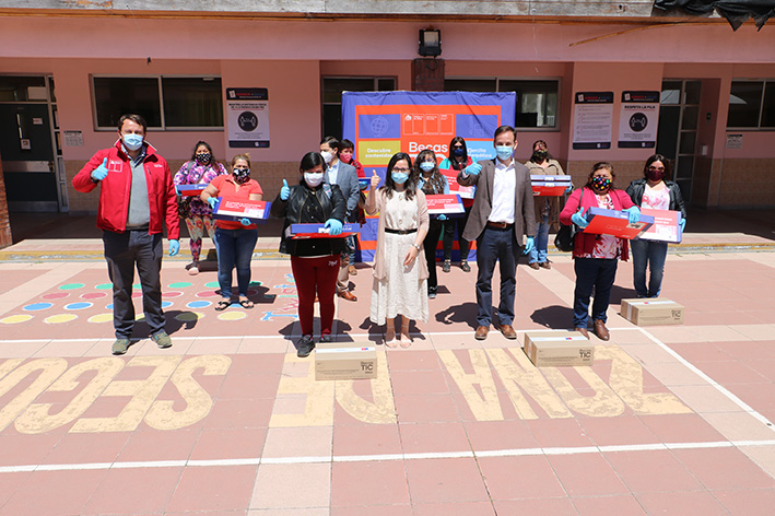 Junto a la Directora del establecimiento Carolina Araya y apoderados de los niños y niñas con alguna discapacidad auditiva, intelectual o visual, se realizó la entrega de estos equipos computacionales, junto a una conexión gratuita a Internet por un año y equipamiento extra acondicionado para cada alumno.
