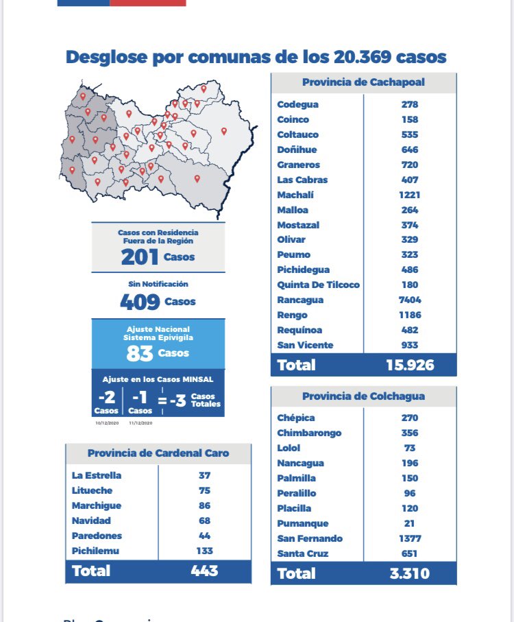 De los 42 contagios, estos corresponden a: 16 de Rancagua, 6 de Coltauco, 4 de Doñihue, 3 de Graneros, 2 de Chépica, 2 de Coinco, 2 de Santa Cruz, 1 de Las Cabras, 1 de Machalí, 1 de Malloa, 1 de Marchigüe, 1 de Quinta de Tilcoco, 1 de Requínoa y 1 de San Fernando.