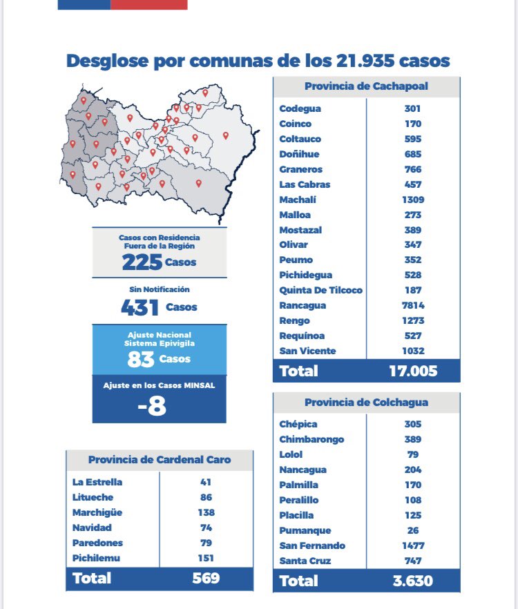 De los 77 contagiados, estos corresponden a: 16 de San Vicente de Tagua Tagua, 11 de Rancagua, 7 de Coltauco, 5 de Graneros, 5 de Chépica, 4 de Santa Cruz, 3 de Peumo, 3 de Pichidegua, 3 de Rengo, 2 de San Fernando, 2 de Codegua, 2 de Las Cabras, 2 de Litueche, 2 de Marchigüe, 2 de Paredones, 1 de Chimbarongo, 1 de Lolol, 1 de Machalí, 1 de Palmilla, 1 de Peralillo, 1 de Quinta de Tilcoco, 1 de Requínoa y 1 caso proveniente de otra región.