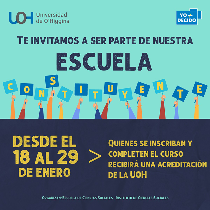 Entre el 18 y el 29 de enero la Universidad de O'Higgins llevará a cabo su "Escuela de Formación Constituyente de Verano", organizada por la Escuela de Ciencias Sociales y el Instituto de Ciencias Sociales de la Casa de Estudios y que se enmarca dentro del segundo ciclo de la campaña informativa Yo Decido. El curso, online y de carácter gratuito, estará impartido por docentes UOH y constará de cinco sesiones. Los asistentes podrán obtener su certificado de participación respectivo. Las inscripciones ya están abiertas para los interesados.
