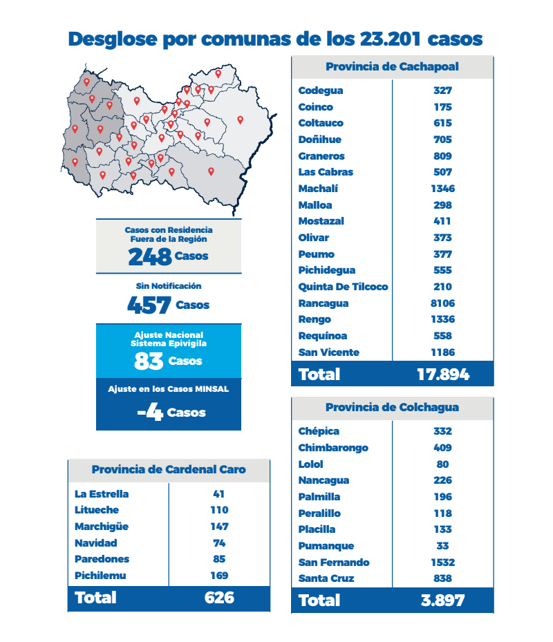 El desglose por comunas es el siguiente, Rancagua 42 casos, San Vicente 24, Malloa 12 casos , Rengo y Peumo 8 casos, Santa Cruz 7 casos, San Fernando, Machalí y Mostazal 5 casos, Requínoa 4, Codegua, Coinco, Coltauco y Graneros 3 casos, Las Cabras, Chimbarongo, Pichidegua y Pichilemu 2 casos, Nancagua, Olivar y Quinta de Tilcoco 1 caso y 2 casos sin notificar.