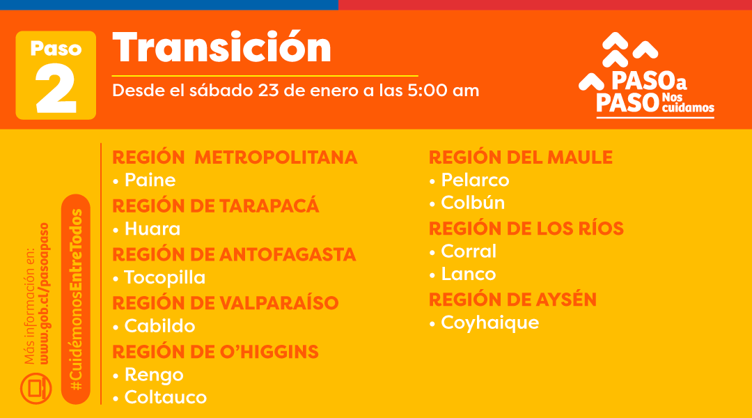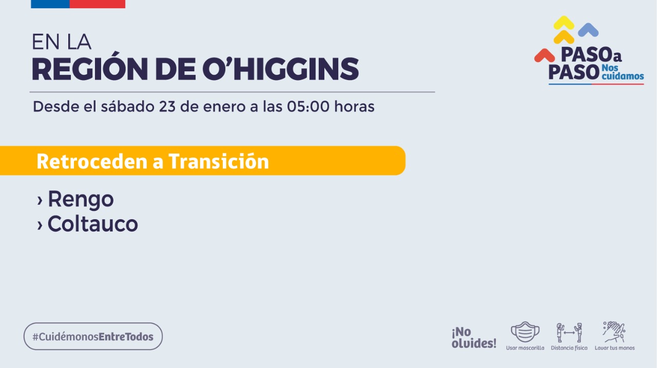 El Ministerio de Salud, informó que a partir de este sábado 23 de enero a las 05:00 horas, las comunas de Rengo y Coltauco retrocederán a Transición, es decir, al paso 2 del Plan Paso a Paso, con cuarentena los fines de semana y festivos.