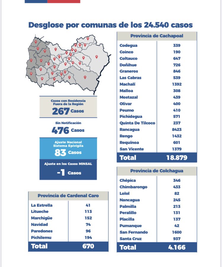 De los 264 contagios, estos corresponden a 22 de las 33 comunas de la zona: 75 de Rancagua, 40 de San Vicente, 23 de Rengo, 18 de Machalí, 12 de Las Cabras, 11 de Graneros, 11 de San Fernando, 10 de Peumo, 10 de Requínoa, 7 de Mostazal, 6 de Pichidegua, 5 de Chépica, 5 de Doñihue, 5 de Olivar, 4 de Chimbarongo, 4 de Quinta de Tilcoco, 4 de Coinco, 3 de Coltauco, 3 de Pichilemu, 1 de Codegua, 1 de Malloa, 1 de Santa Cruz, 2 casos en otras regiones y 3 casos sin notificar.