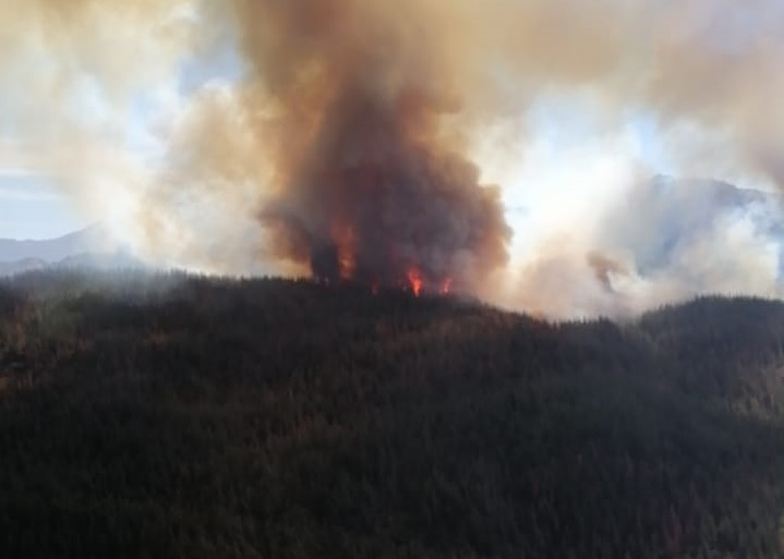 El último informe de Conaf señala que hasta ahora se ha consumido una superficie de más de 50 hectáreas de plantaciones de pino. El fuego se encuentra en intensidad de rápida propagación debido al viento reinante en la zona.