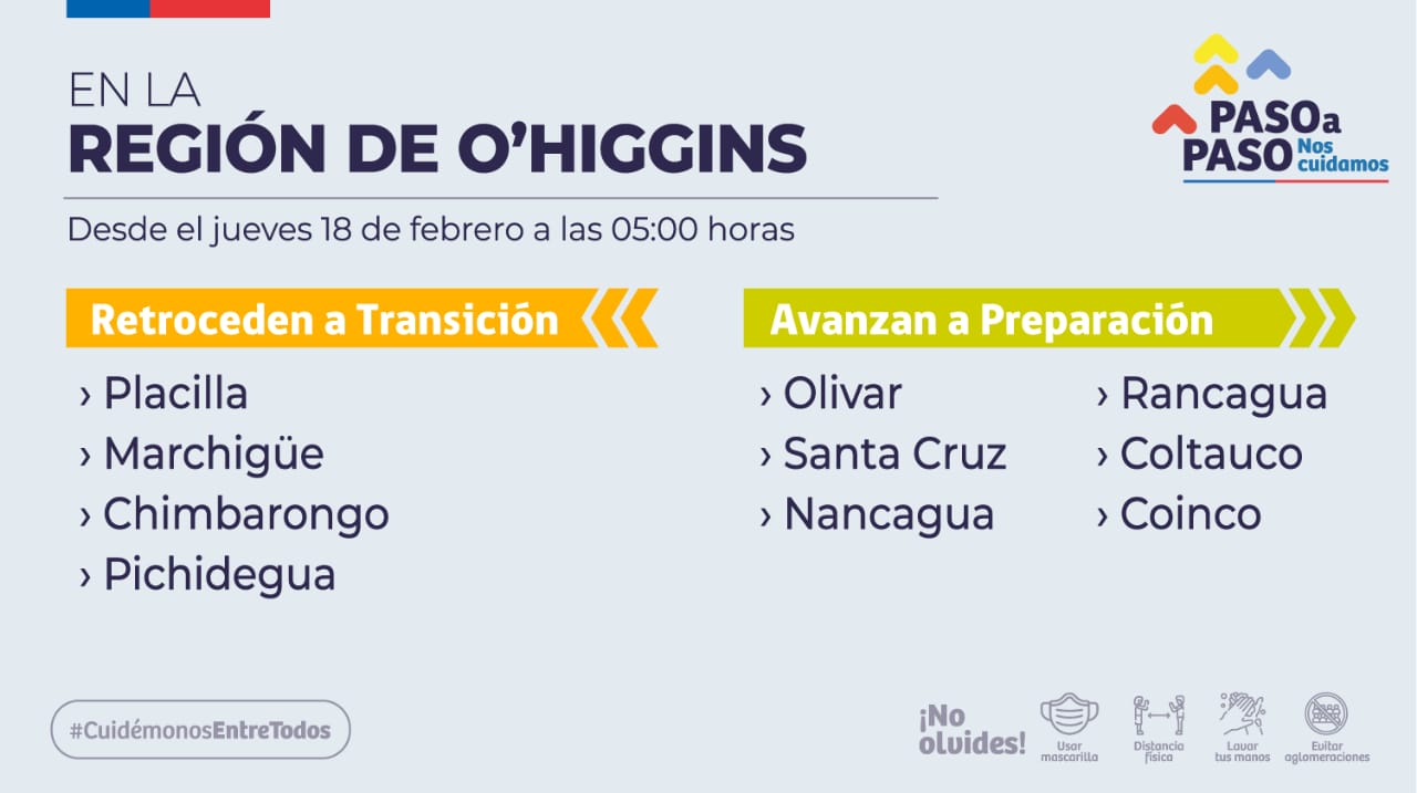 Placilla, Marchigüe, Chimbarongo y Pichidegua retroceden a Transición, es decir al Paso 2, con cuarentenas los fines de semana. Por su parte las comunas de Rancagua, Olivar, Coinco, Coltauco, Nancagua y Santa Cruz avanzan a Preparación. Con esto a partir del día jueves 20 comunas estarán en Transición y 13 en Preparación.