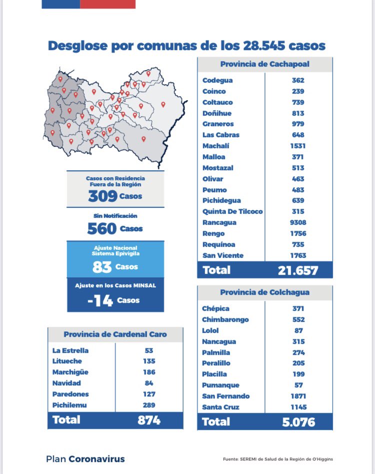 El desglose por comunas es el siguiente: 13 en Rancagua, 10 en San Fernando, 8 en Peralillo, 6 en Nancagua, 5 en Machalí y Chimbarongo, 4 en Mostazal, Rengo, Las Cabras y Santa Cruz, 3 en Coltauco, Pichilemu y Placilla, 2 en Quinta de Tilcoco, Requínoa, Palmilla, Navidad, San Vicente y Coinco, 1 en Codegua, Doñihue, Graneros, Marchigüe, Olivar, Paredones y Pichidegua, 2 de otras regiones y 5 casos sin notificar.