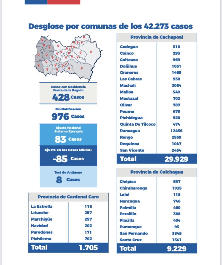 De los 387 contagiados, estos corresponden a las siguientes comunas: Rancagua 81, San Fernando 50, San Vicente 33, Graneros 21, Pichidegua 20, Las Cabras 19, Rengo 16, Machalí 12, Mostazal 10, Requínoa 9, Chimbarongo 9, Malloa 8, Pichilemu 7, Peumo 6, Quinta de Tilcoco 6, Santa Cruz 6, Placilla 5, Nancagua 5, Doñihue 5, Olivar 5, Codegua 4, Palmilla 3, Peralillo 3, Chépica 3, Marchigue 3, Navidad 2, Coinco 1, Litueche 1, Lolol 1, Pumanque 1, 7 casos de otras regiones y 25 casos sin notificar.