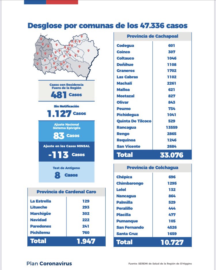 El desglose por comunas es el siguiente: Rancagua 52 casos, San Fernando 28, Las Cabras 12, Chimbarongo 11, Machalí y San Vicente 10 casos, Rengo 9, Pichidegua 8, Graneros 7, Mostazal 6, Placilla y Paredones 5, Peralillo, Olivar y Requínoa 3 casos, Codegua, Doñihue, Nancagua y Santa Cruz 2 casos, Chépica, Navidad, Palmilla, Peumo y Pumanque 1 casos, Otras Regiones 3 casos y Sin Notificar 6 casos.
