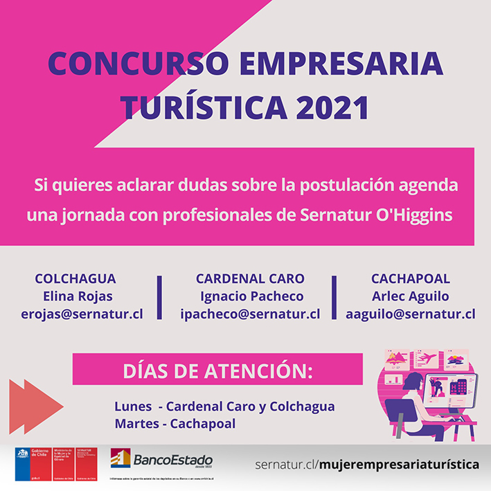 "Invitamos a las emprendedoras de nuestra región a participar del Concurso Mujer Empresaria Turística, esta iniciativa sin duda es un reconocimiento a mujeres esforzadas y resilientes, que han sido capaces de superar los obstáculos que ha traído consigo la pandemia COVID19. Para Sernatur, es fundamental impulsar el desarrollo y el posicionamiento de productos turísticos innovadores con enfoque de experiencias, distinguiendo casos de empresas con sello femenino que han apostado por este camino, que son inspiradoras y pudieron continuar a pesar de la crisis", señaló, Jorge Espinoza Bustos, director regional (s) Sernatur O'Higgins.