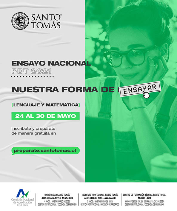 Con el propósito de brindar apoyo y herramientas para los alumnos de enseñanza media y egresados de cuarto medio, preparándolos para rendir una buena Prueba de Transición para la Admisión Universitaria (PDT), Santo Tomás organizará entre el 24 y 30 de mayo el Ensayo Nacional PDT 2021.