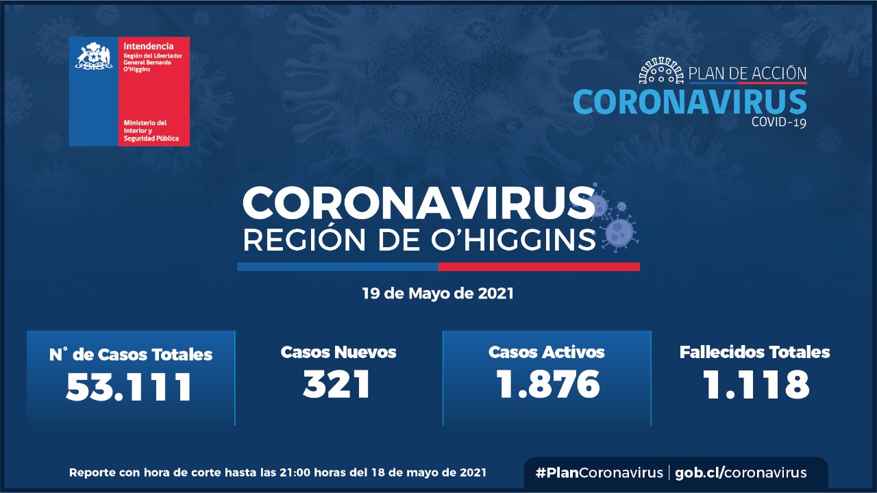 En la ocasión no se reportó pacientes fallecidos a causa de la pandemia en la región durante las últimas horas por lo que la cifra se mantiene en 1.118 decesos. El total de casos registrados en O'Higgins desde la llegada del coronavirus al país son 53.111. En las últimas horas se realizaron 1.360 muestras de PCR con una positividad de 20,8%.