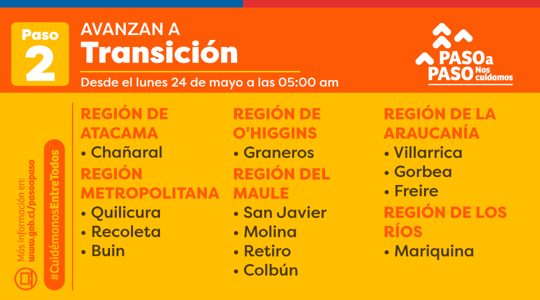 Hoy jueves, las autoridades sanitarias dieron a conocer una nueva actualización sobre el avance del Covid-19 en el país, respecto a la región de O´Higgins tendrá dos modificaciones en el plan “Paso a Paso” donde la comuna de Graneros avanzará a etapa de Transición (Paso 2) a contar de este lunes a las cinco de la madrugada. A su vez, la comuna de Peumo retrocederá a esta fase a contar de mañana sábado, en el mismo horario.