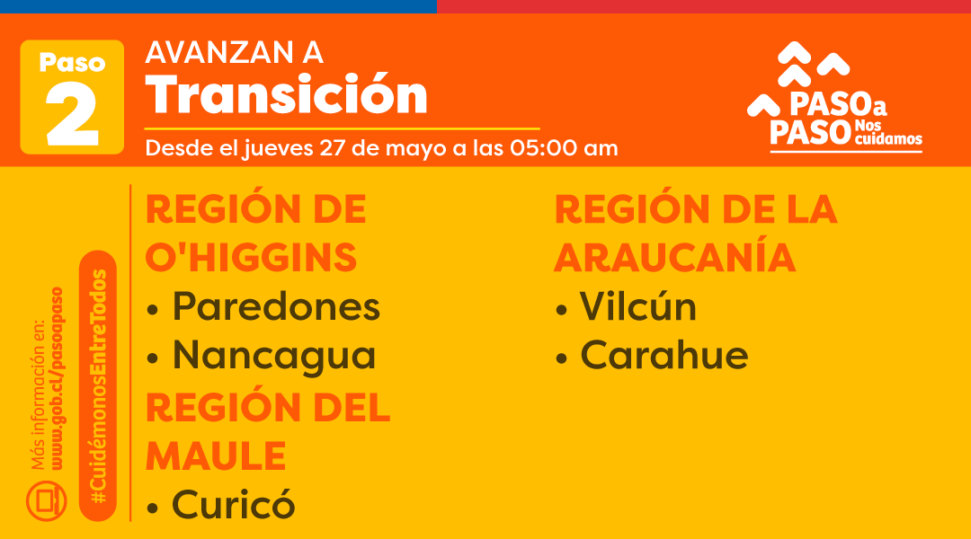 El Ministerio de Salud informó que las comunas de Nancagua y Paredones avanzarán a Transición (Fase 2) desde este jueves 27 de mayo a las 05:00 horas, en el Plan Paso a Paso que tiene el gobierno para el control de la pandemia.