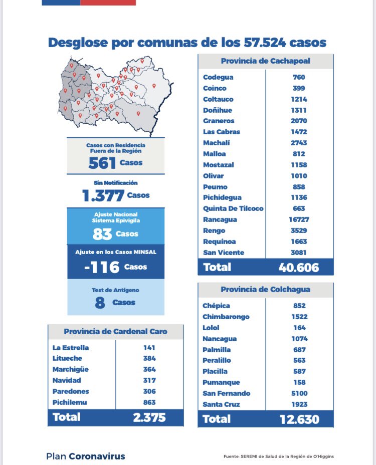 De los 345 contagiados, estos corresponden a las siguientes comunas: Rancagua 161, Machalí 20, Mostazal 15, Rengo 14, San Vicente 14, Requínoa 9, Graneros 9, San Fernando 7, Santa Cruz 7, Malloa 7, Chépica 6, Doñihue 6, Pichilemu 6, Litueche 6, Las Cabras 5, Navidad 5, Nancagua 4, Paredones 4, Chimbarongo 4, Coltauco 3, Codegua 3, Placilla 2, Olivar 2, Pichidegua 2, Coinco 1, Lolol 1, Marchigüe 1, Peralillo 1, Peumo 1, Otras Regiones 6 y Sin notificar 13.