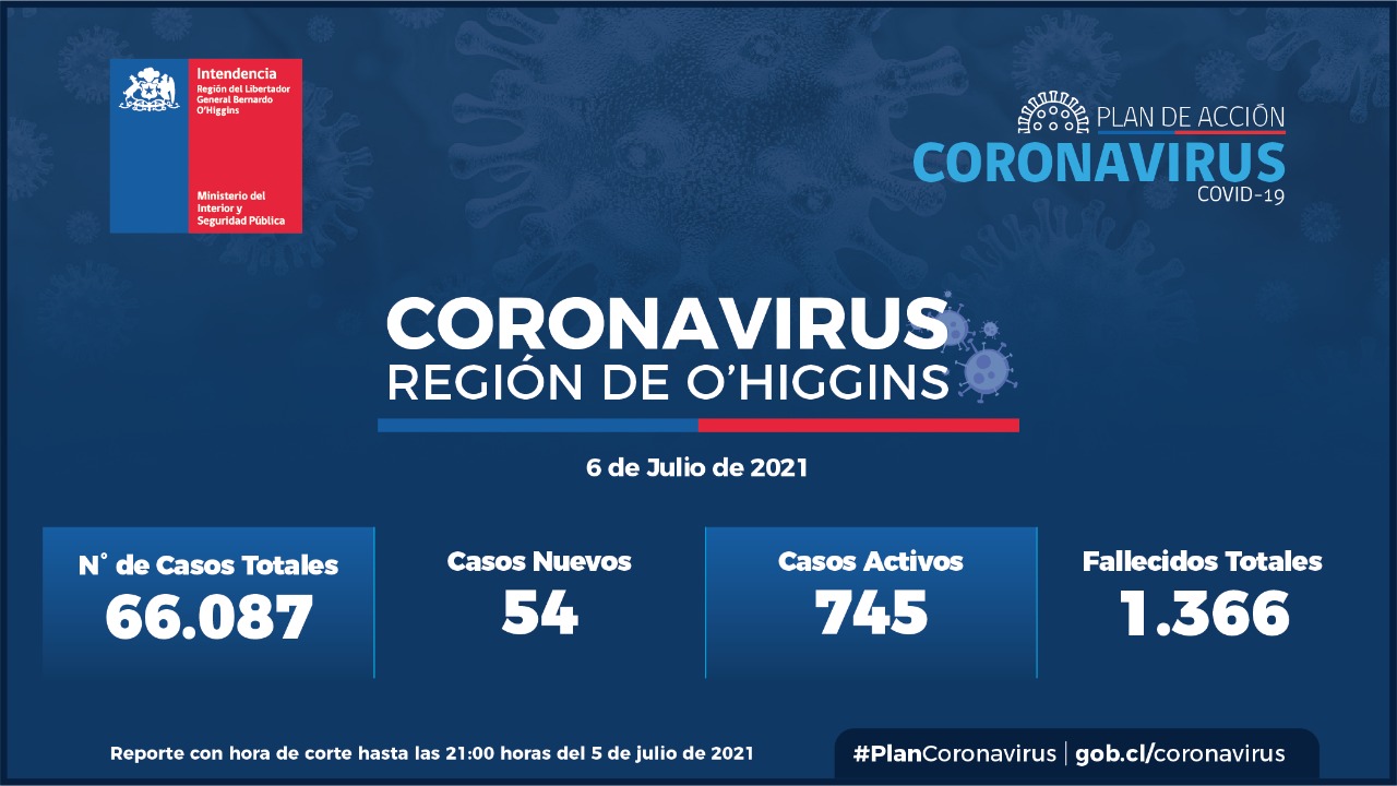 El Minsal informó hoy martes que la región de O'Higgins registró 54 nuevos contagios, de los cuales 45 pacientes registran síntomas, 8 casos son asintomáticos y 01 caso sin notificar. Los casos activos en la región son 753, mientras que los recuperados alcanzan las 63.937 personas. Se realizaron 1.058 muestras PCR con una positividad del 4,0%.