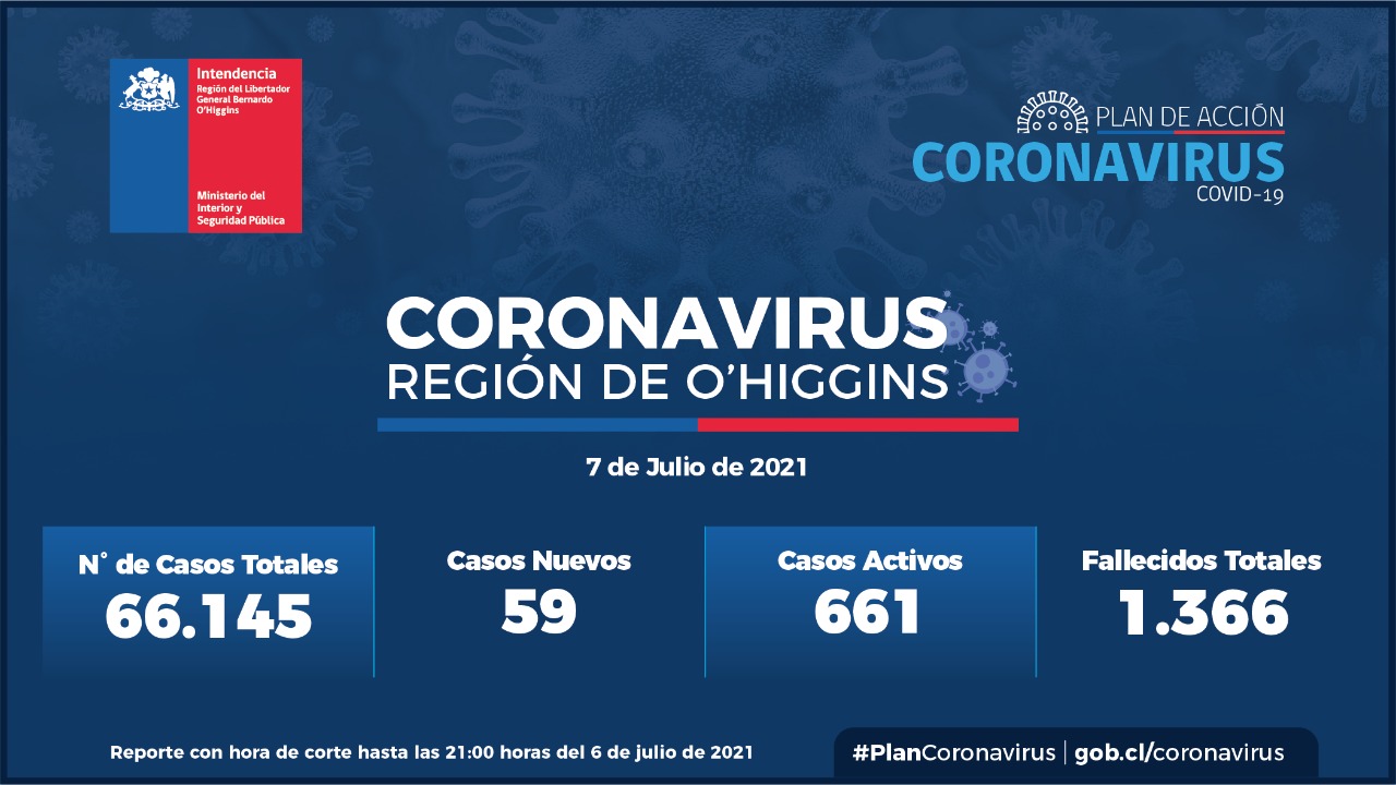 De acuerdo al reporte emitido desde el Ministerio de Salud hoy miércoles, la región de O’Higgins registró 59 nuevos contagios por Covid-19, de los cuales 45 pacientes registran síntomas, 14 casos asintomáticos y un caso sin notificar.