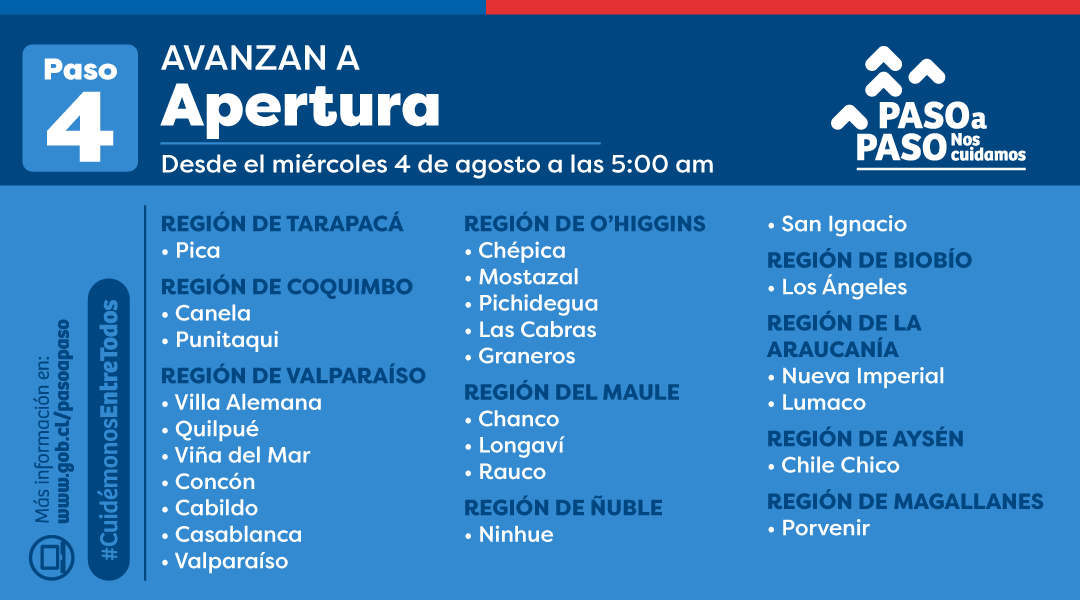 Las autoridades del Ministerio de Salud informaron que cinco comunas de la región de O’Higgins avanzarán a la Fase 4 de Apertura Inicial en el Plan Paso a Paso a contar de este miércoles 4 de agosto a las 05:00 horas.
