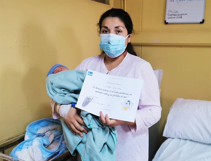 Dentro de las actividades conmemorativas por el "Mes de la Lactancia Materna en Hospital San Fernando", el Programa Chile Crece sumó una nueva instancia de cercanía con las usuarias y sus hijos(as) recién nacidos: la entrega de un diploma de fomento a la lactancia materna con la huella del pie del "bebé".