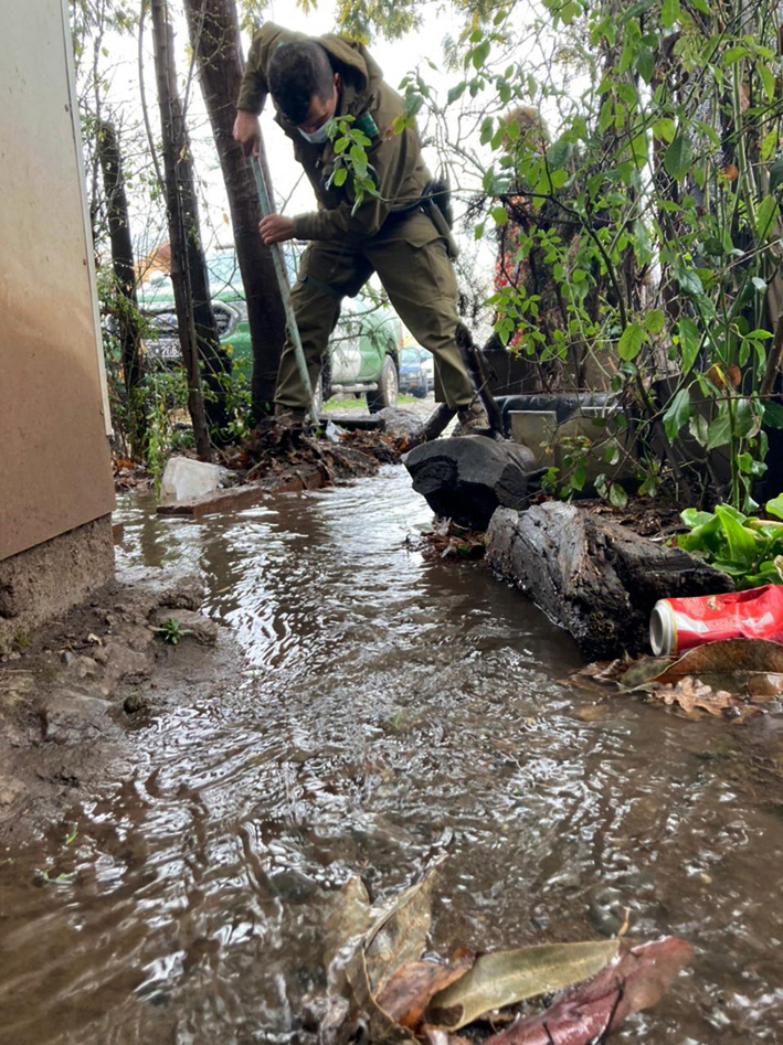 Carabineros ha cumplido un rol fundamental durante la contigencia por el sistema frontal. La imagen corresponde a funcionarios del Retén Fronterizo de Puente Negro trabajando intensamente con la comunidad para evitar que el agua ingrese a los hogares