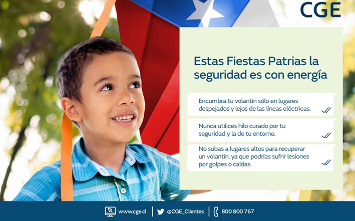 Con una invitación a celebrar de forma segura estas Fiestas Patrias, CGE está entregando una serie de recomendaciones a través de sus redes sociales, sobre el autocuidado para evitar posibles accidentes o acciones de riesgo, principalmente, asociados a la práctica de elevar volantines.