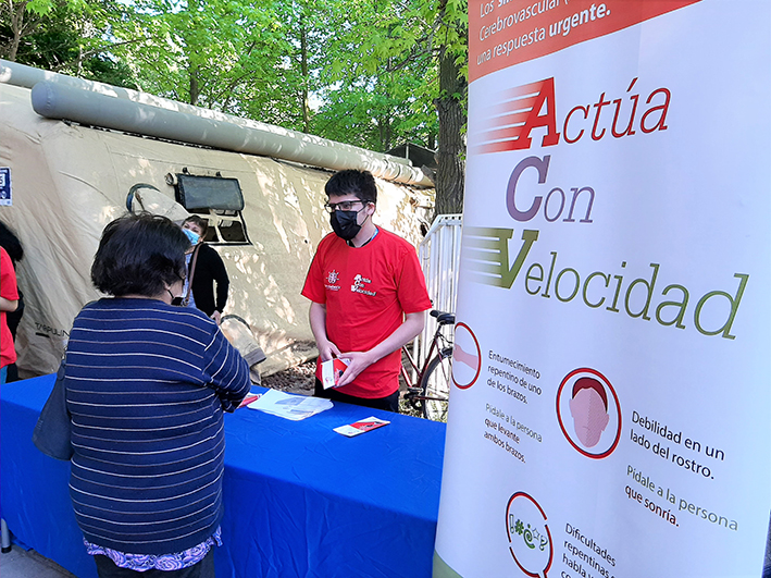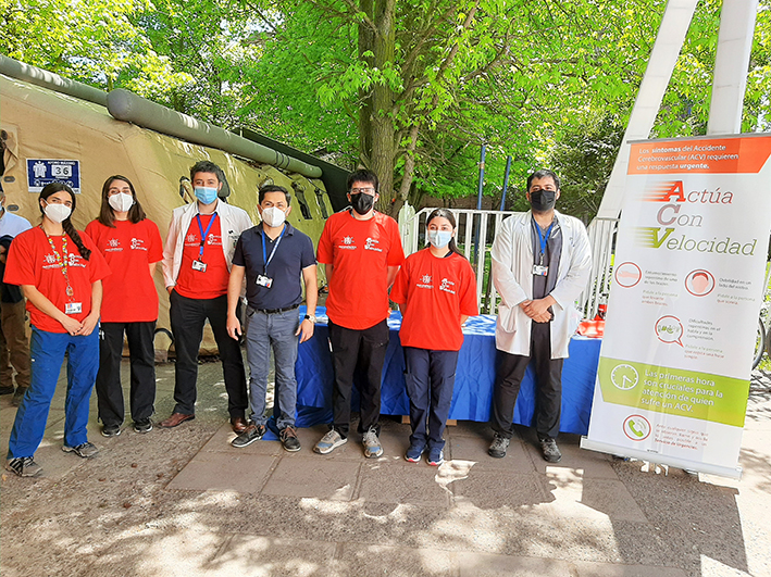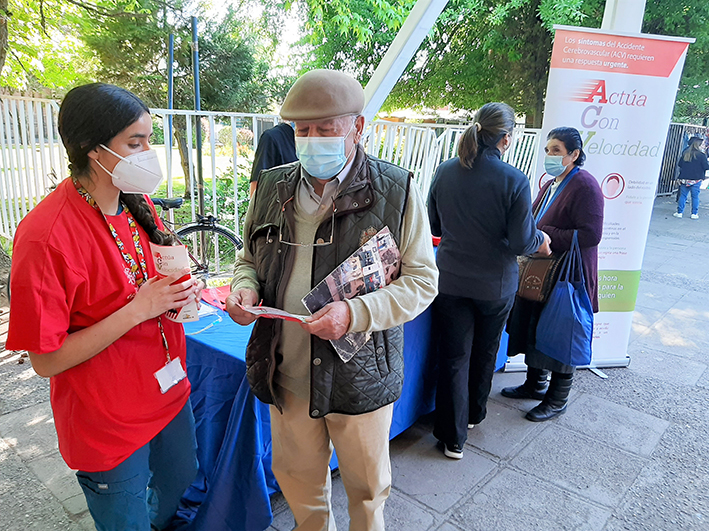 Los doctores Mauricio Hormazábal y Jaime Medina, neurólogos, acompañados por internos de distintas áreas de la salud, se ubicaron en el frontis del centro asistencial para sociabilizar con los usuarios que se encontraban en las salas de espera del Consultorio Adosado de Especialidades (CAE), y así entregar esta valiosa información sobre los cuidados para evitar y/o detectar un ACV.