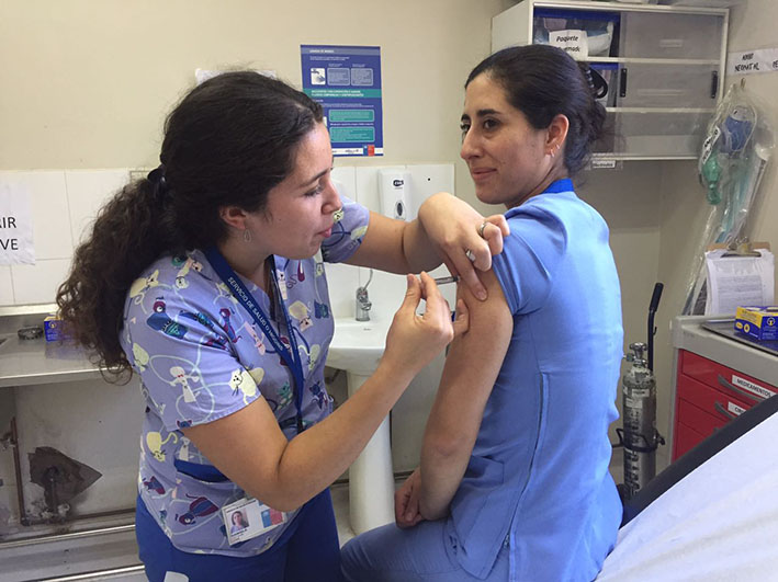 Por lo mismo, la profesional enfatiza que "Hoy no solo se está vacunando a los grupos de riesgo como embarazadas (sobre 13 semanas de gestación), niños hasta los 6 años, adultos mayores o enfermos crónicos, sino también a todo público". Tanto, la enfermera como la tens, Daniela Jofré pueden realizar la vacunación.