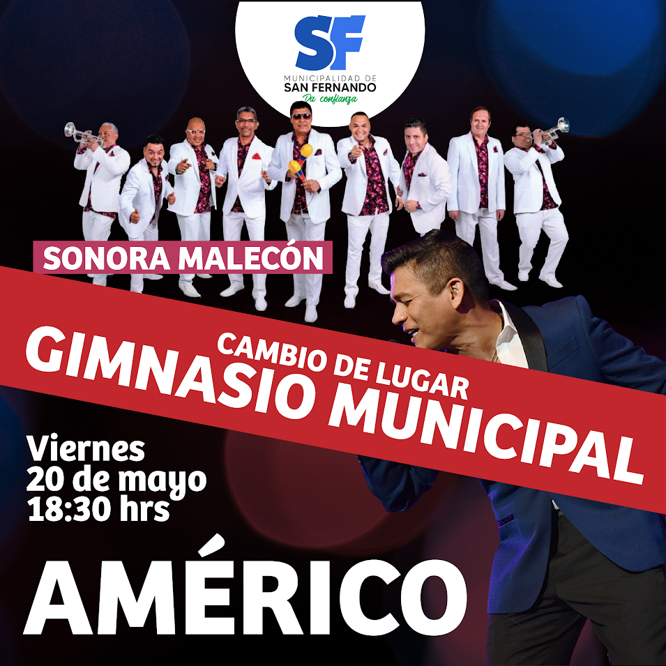 Debido al pronóstico de lluvias anunciado para mañana viernes, este show organizado por la Municipalidad de San Fernando, donde se presentarán La Sonora Malecón y Américo, será trasladado al Gimnasio Municipal de nuestra comuna.