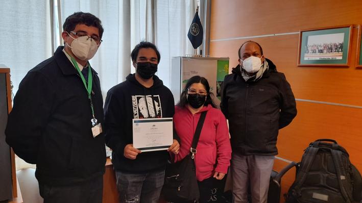 Junto a su madre, Mónica Bustamante, Yeremy recibió el diploma y una gift card de manos del Coordinador de Idiomas, Carlos Gallardo, y el Rector de Santo Tomás Rancagua, Manuel Olmos.