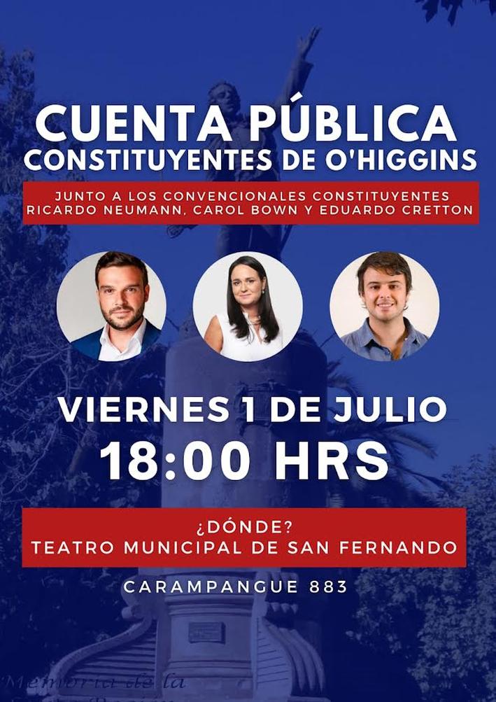 Hoy, a las 18:00, los convencionales constituyentes Ricardo Neumann (distrito 16), Carol Bown (distrito 15) y Eduardo Cretton (distrito 22) se reunirán en el Teatro Municipal de San Fernando con el objetivo de hacer un balance del proceso constituyente.