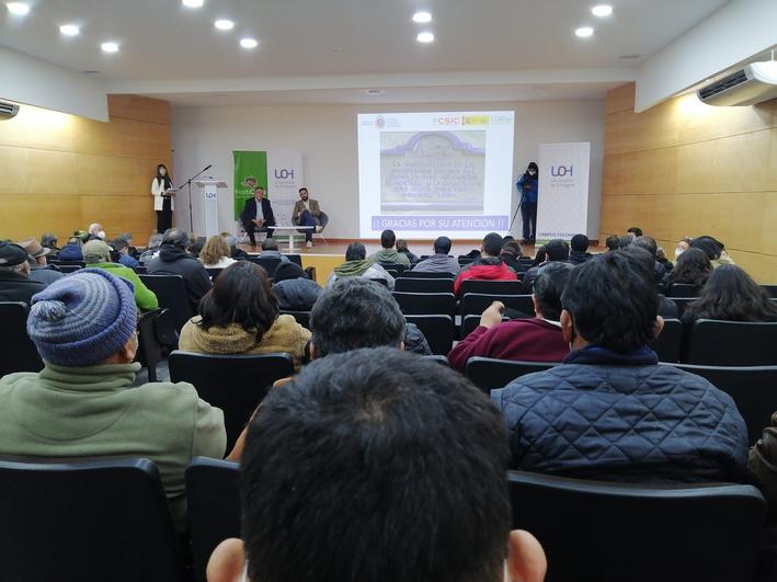 La jornada continuó con la presentación de Alan Pinto, Ingeniero Agrónomo de la Universidad de Chile, quien expuso sobre cultivos aeropónicos. El seminario finalizó con la ponencia del profesor Vicente Martínez, Vice-director del CEBAS-CSIC, quien habló sobre la horticultura del futuro, la agricultura vertical, con luces y sensorización, esto último centrado en conocer las necesidades hídricas, el control de heladas y plagas de las hortalizas.