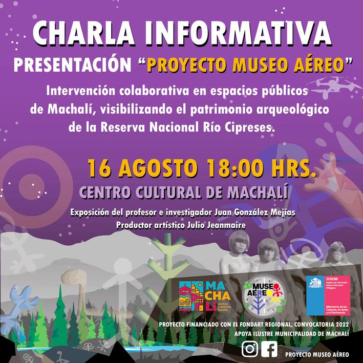 El 16 de agosto en el Centro Cultural de Machalí, se realizará la primera charla informativa sobre el proyecto “Museo Aéreo: Intervención colaborativa en espacios Públicos de Machalí, visibilizando el patrimonio arqueológico de la Reserva Nacional Río Cipreses”, financiada por el Ministerio de las Culturas, las Artes y el Patrimonio a través de los Fondos de Cultura Regional 2022, en la línea Creación Artística.
