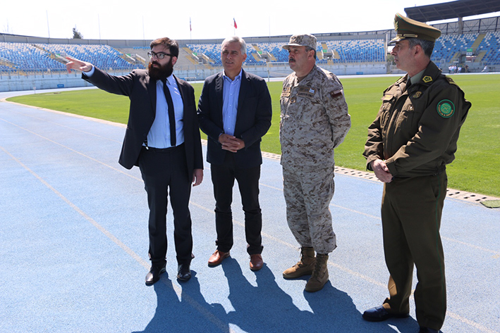 El Intendente de O´Higgins, Pablo Silva, junto al General de la Brigada de Aviación del Ejército, Gustavo Núñez, el General de la VI Zona de Carabineros, José Rivera y el Seremi de Transportes, Francisco Lara, inspeccionaron las dependencias del Estadio El Teniente con motivo que en este lugar se realizará el tradicional Desfile del 2 de Octubre.