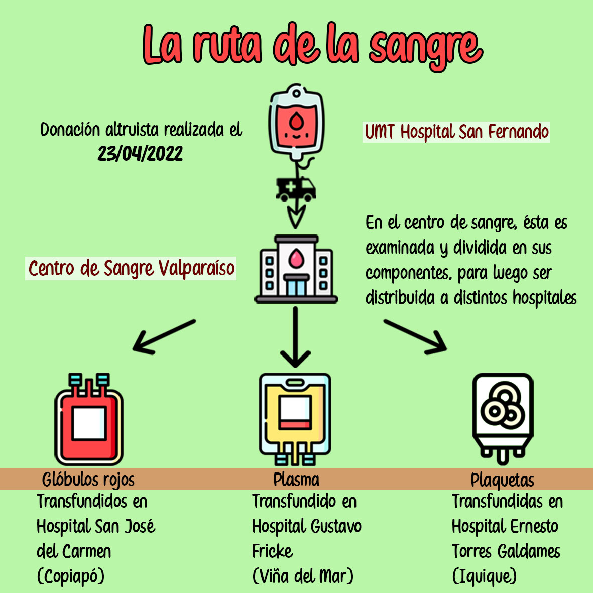 Dentro de la UMT existe una subunidad denominada “sección donación”, la que tiene por objetivo realizar la promoción y captación de donantes voluntarios de sangre, la atención de donantes de reposición, la recolección de la sangre donada y el envío de ésta a uno de los cuatro Centros de Sangre de país (Valparaíso, Metropolitano de Santiago, Concepción y Austral en Puerto Montt). El que le corresponde a nuestro hospital, se encuentra en la ciudad de Valparaíso y es el encargado de abastecer a nuestra región con todos los componentes sanguíneos que necesitemos.