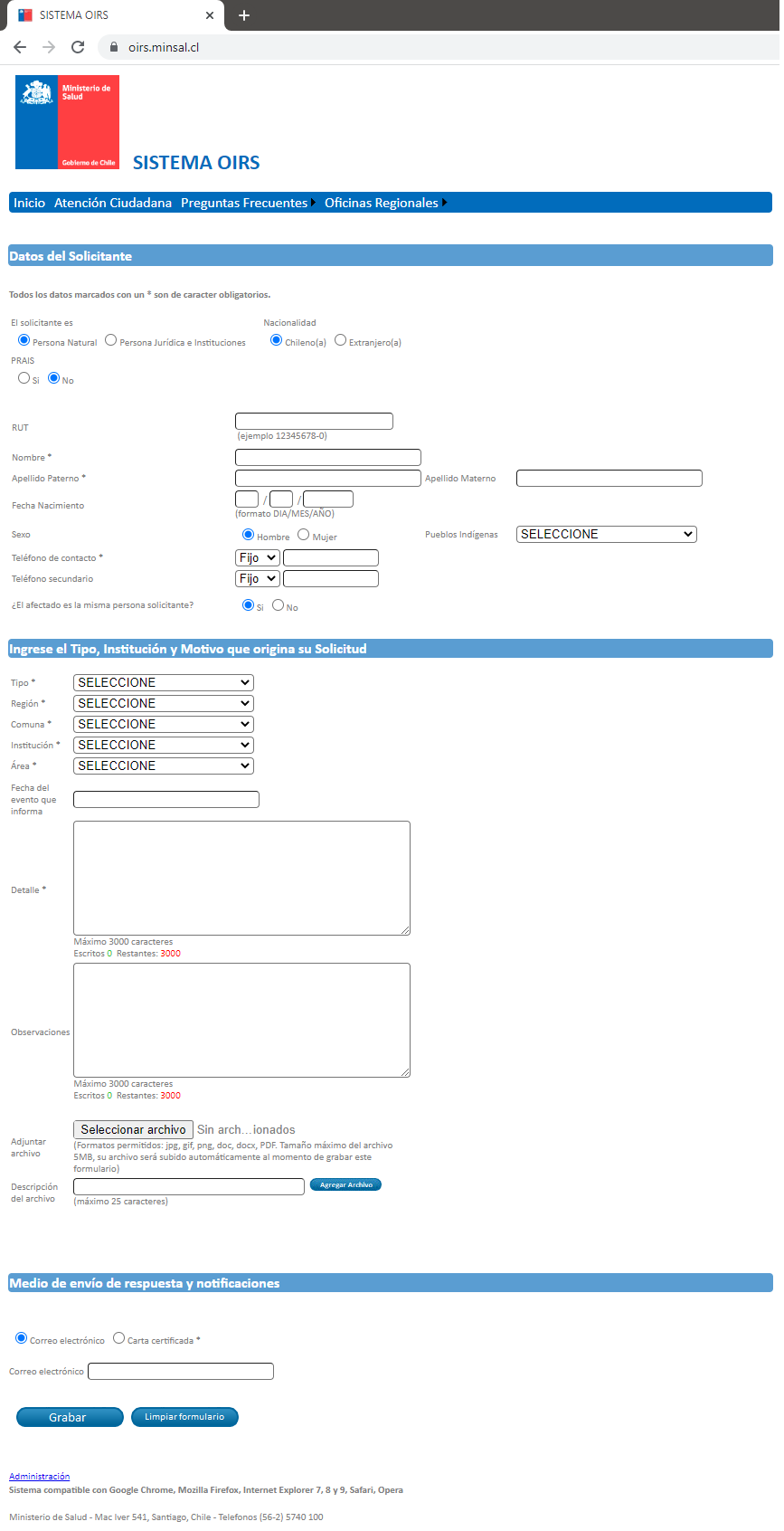 Para realizar una solicitud ciudadana de forma virtual, puede ingresar a la página web oirs.minsal.cl y completar el formulario digital.
