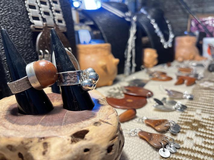 “El picoyo proviene de la Araucaria, es el nudo que une la rama al tronco. Cuando el Pehuén muere, deben pasar cientos de años para que éste alcance su estado de descomposición. Durante este tiempo toda la resina de este árbol sagrado se sitúa en este nudo y cuando ya se convierte el polvo, suelta el picoyo o chuchín. Dependiendo de donde esté la Araucaria es el color de la madera, si cae a la tierra, el picoyo es café, si cae al agua es negro. El tenerlo en mis joyas, el poder trabajarlo es un orgullo tremendo y genera un vínculo muy fuerte con la tierra y con la comunidad a la que pertenecen mis productos”, explica la artista y periodista Claudia Huenchullán.